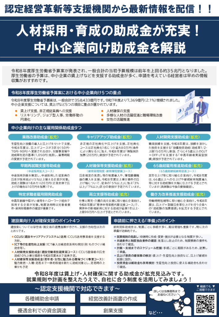 中小企業診断士の資格を活かし、補助金申請・資金調達・経営計画のご相談にも対応。