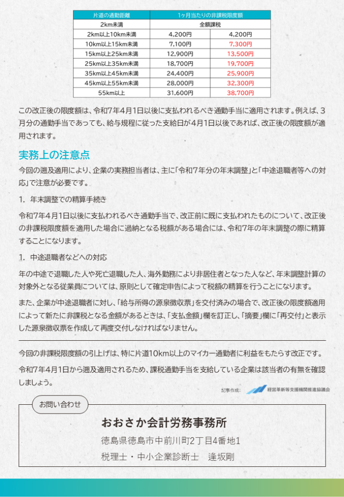 令和7年4月1日から遡及適用されるため、課税通勤手当を支給している企業は該当者の有無を確認しましょう。